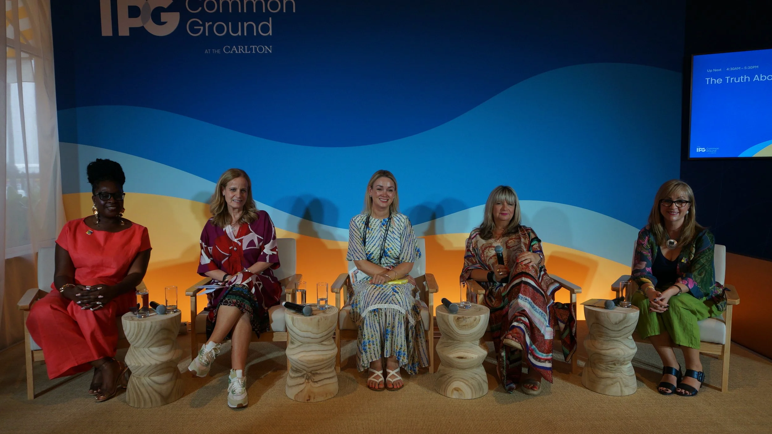 Image from the “OutrAGE: Addressing ageism in advertising” panel, with five participants sitting on chairs on stage. From left to right: Aba Blankson, Jackie Cooper, Claire McHardy, Nicky Bullard, Sara Denby (panel host). Photo credit: UN Women