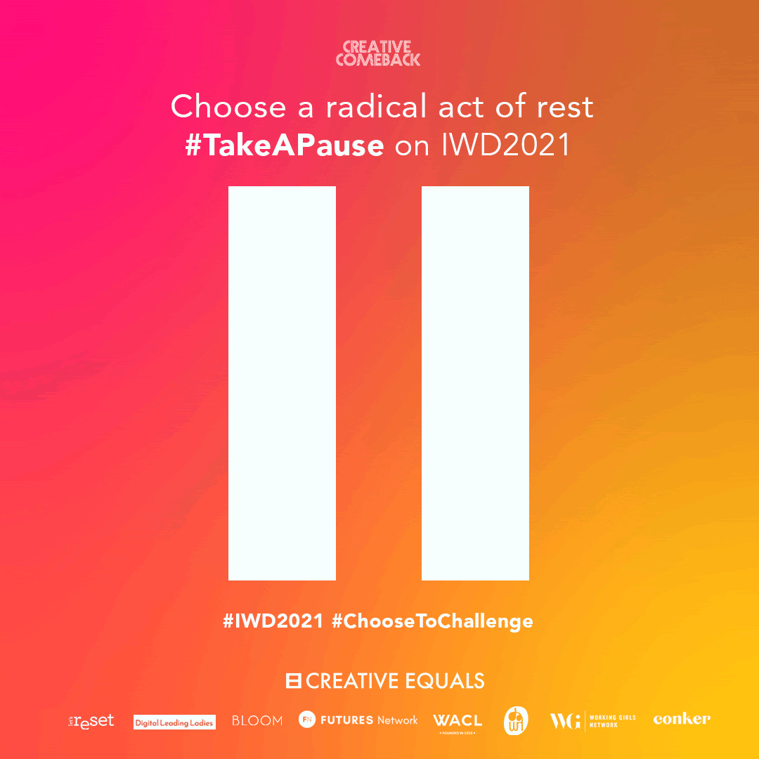 That's why this IWD, the CreativeComeback returners are asking the industry to #TakeAPause at 11am TODAY and consider the long-term impact of the pandemic on gender equality in their businesses and their gender pay gap.
